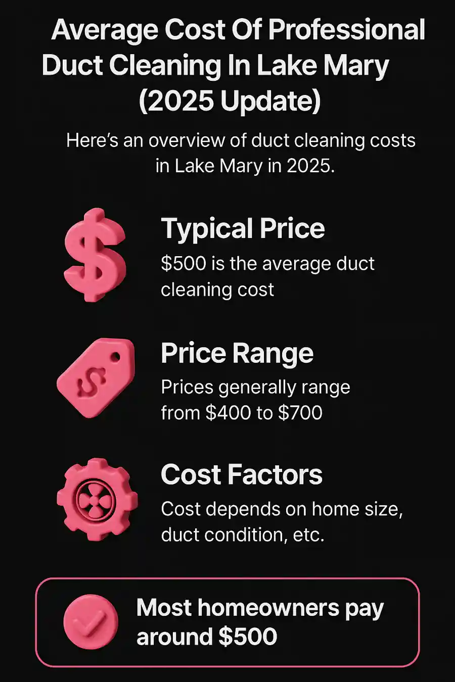 Professional duct cleaning helps improve indoor air quality, reduce dust, and keep your HVAC system running efficiently. In Lake Mary, the average cost typically ranges from $300 to $600 for a standard residential home. However, the final price can vary based on several factors:
