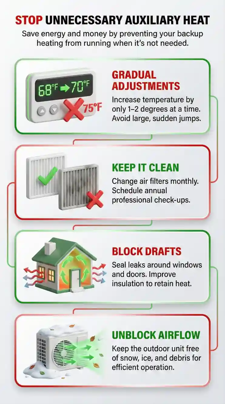 Bottom line: Don't disable aux completely—configure it to activate only when genuinely needed. The goal isn't zero aux operation. The goal is appropriate aux operation during actual cold weather.